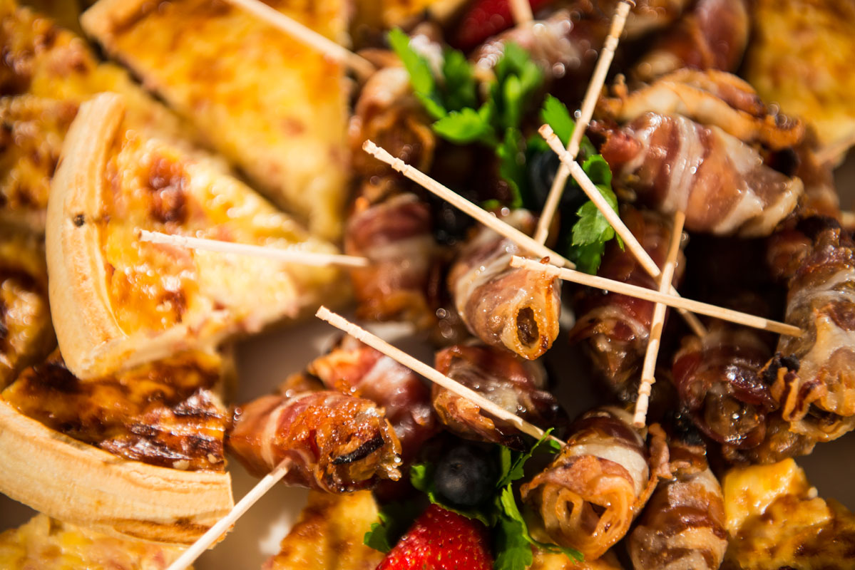 Miniwraps, verschieden gefüllte Crêpes, Yakitorispieße